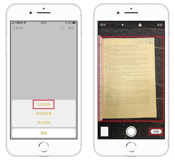 2.接下来你会看到,在底部出现3个选项,我们选择【扫描文稿】功能,将镜头对准纸质文稿,屏幕上出现的黄色区域,可以自动识别出文档,接着点击【储存】按钮。