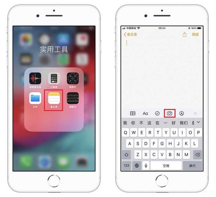 1.在苹果手机上找到自带的【备忘录】,打开这个应用后,进入内容编辑界面,很多人都是在这里输入文本的,如果点击键盘上方的照相机按钮,有一个隐藏功能。