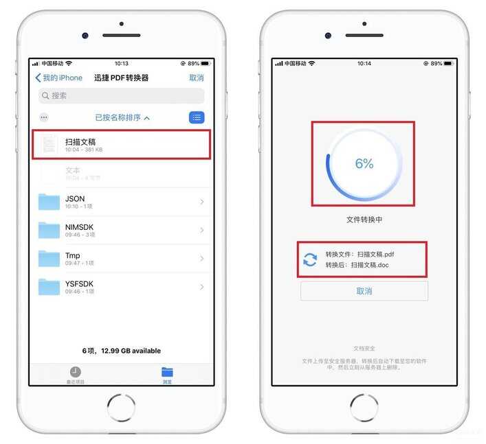 2.随后从手机文件夹中,找到刚才扫描的PDF电子文档,直接点击文件,就能自动进入转换页面,从这里将会看到,文件转换的进度,以及文件转换的格式详情。
