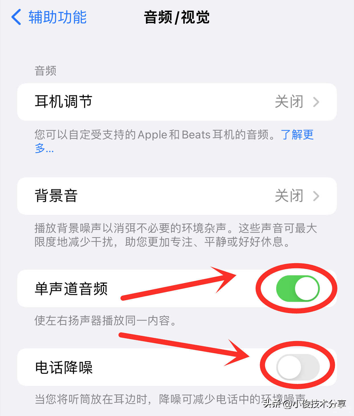 接着,我们可以看到在【音觉和视觉】设置页面中,有一个【单声道音频】和【电话降噪】的开关,此时我们别要对这2个开关进行设置