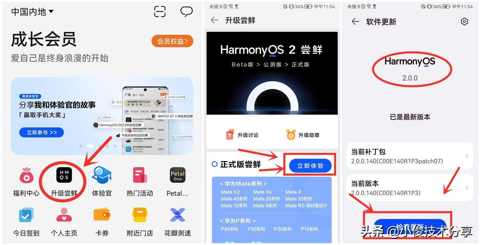 打开之后选择【升级尝鲜】,点击【升级尝鲜】之后,可以看到有个【立即体验】的按钮,我们点开这个【按钮】!然后同样也会进入到【检查更新】设置中心,我们只需点击【检查更新】开关,也可以自动帮我们升级鸿蒙系统!