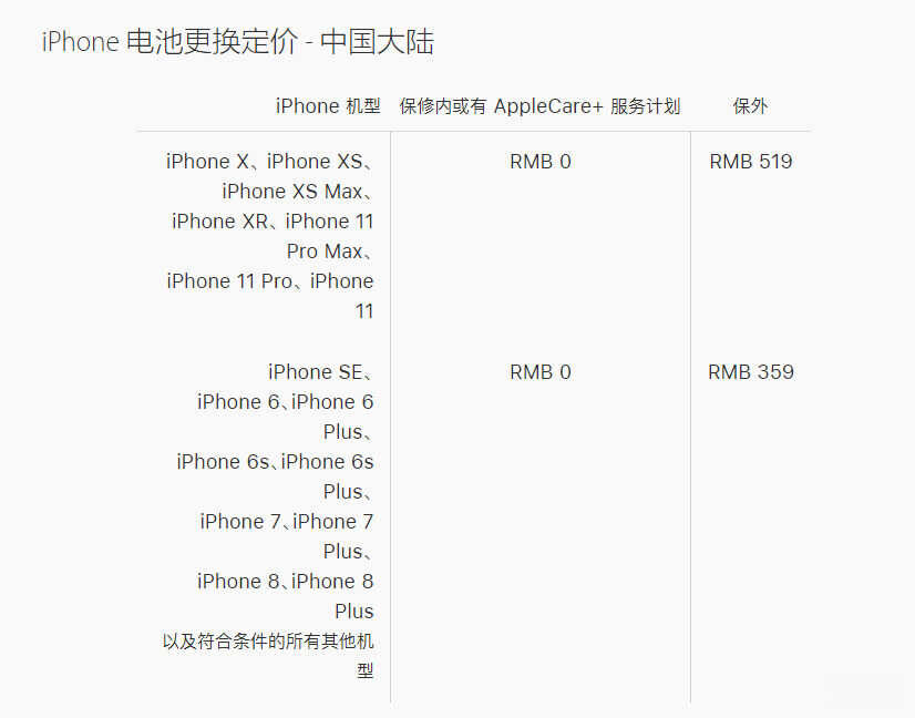 如果 iPhone 的电池最大容量低至 80%,已经过了保修期,您也可以交付一定的服务费用,通过苹果官方售后进行更换,价格如下: