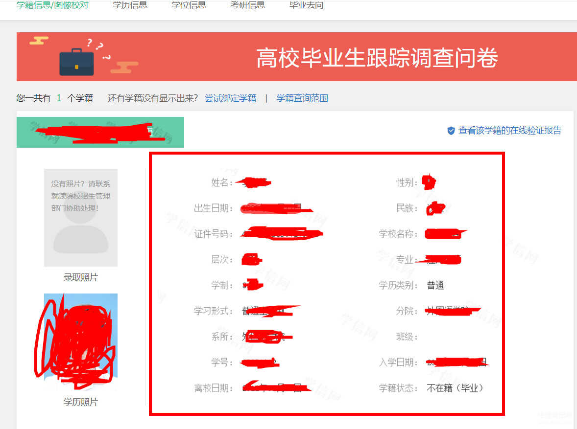 第六步:完成身份验证后就可以查到自己对应的学籍及学历信息: