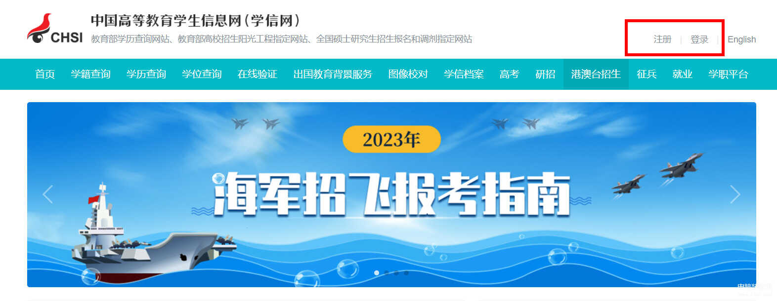 第二步:进入官网后,在导航栏右上侧点击登录页面,若没有学信网账号,可以点击注册按钮,按照要求进行注册账户即可,注册账户需要准备好一个手机号。