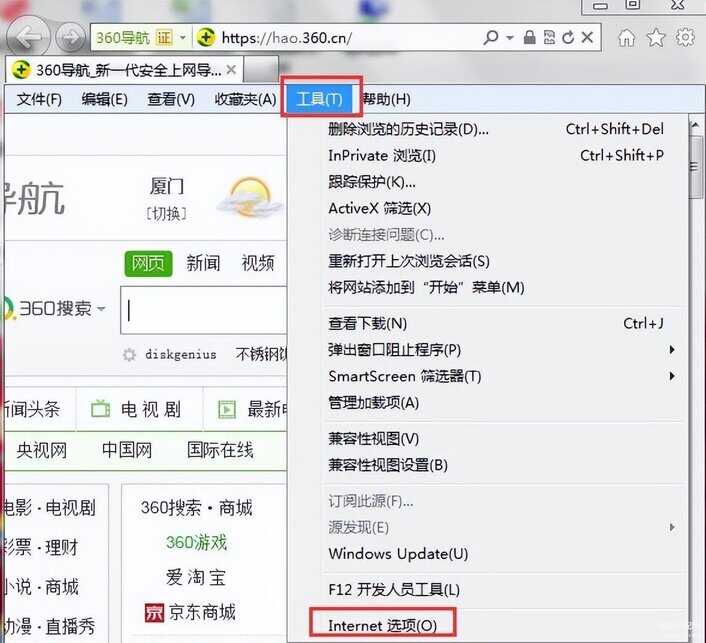 1、打开ie浏览器找到工具选项选点击nternet 选项,如下图所示: