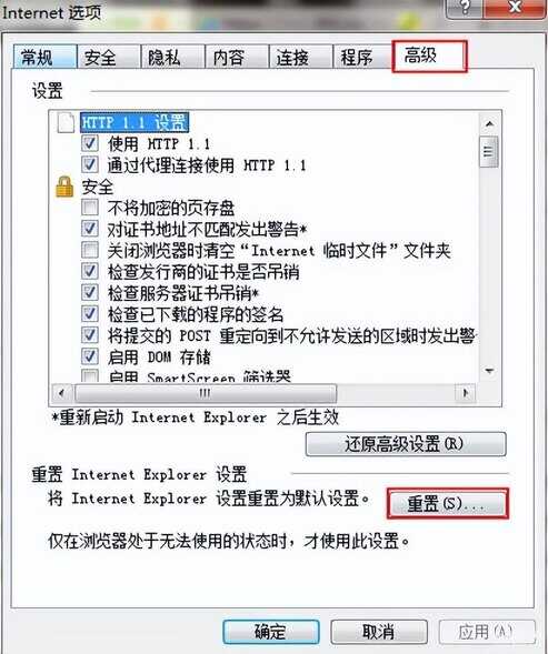 2、切换到高级选项然后点击重置,如下图所示: