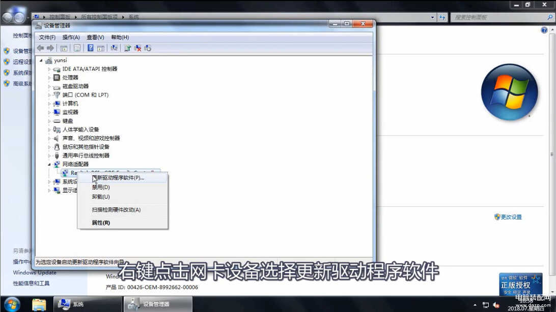 4、右键点击网卡设备,然后选择【更新驱动程序软件】即可。