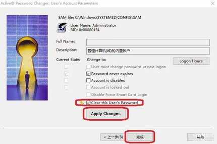 勾选上“Clear this User's Password”,点击“Apply Changes”,最后点击“完成”就大功告成了。
