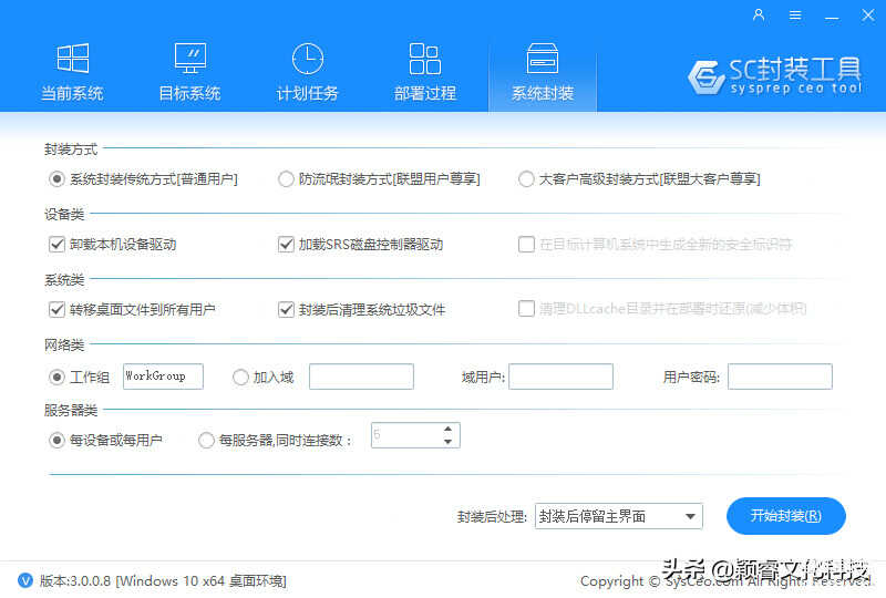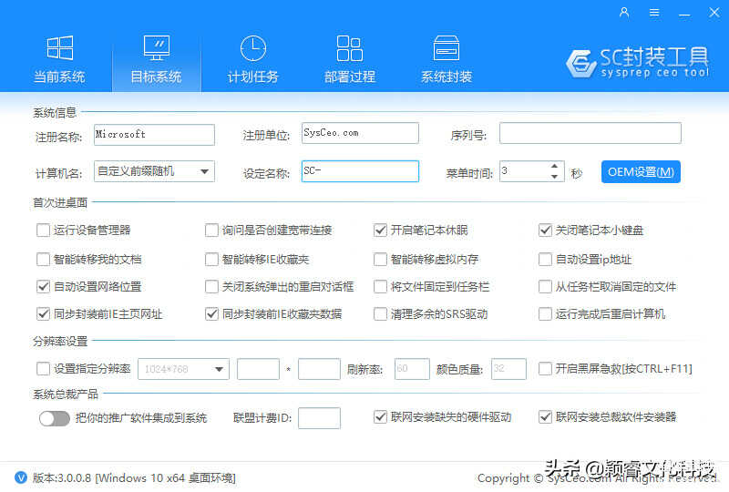 SC系统封装工具是系统总裁开发的一款面对Windows操作系统封装的辅助工具,Sysprep Chief Executive Officer 意为系统封装首席执行官,简称”SC”目前已经更新到了SC3.0,于2018年6用6号正式公测发布,新增多种新功能,传统封装模式,防流氓封装模式,大客户封装模式,可以有效的提高系统封装GHO里面推广软件及主页的量,减少损失提高效率,SC3.0为重新编写,全新开发,对SC2.0做了一些取舍,修复SC2.0已知BUG的同时延续其优点,简单易用,一步到位,界面友好、简单易用、智能高效、自定义强、支持WindowsXP、Vista、7、8、8.1、10及其对应的服务器系统,是学习研究系统封装爱好者的首选。