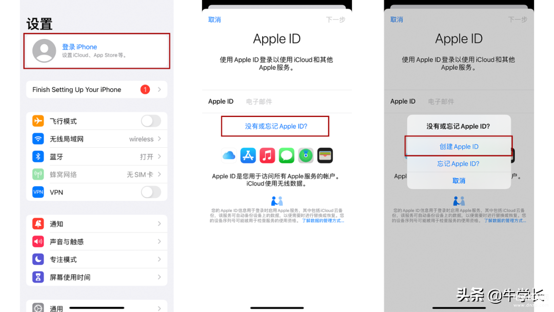 如果在设置新iPhone时,没有进行Apple ID的注册,也可在设置中AppleID登录界面直接注册。