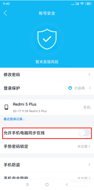 3、找到“允许手机电脑同步在线”选项,此时我们可以看到,这个选项是没有打开的。