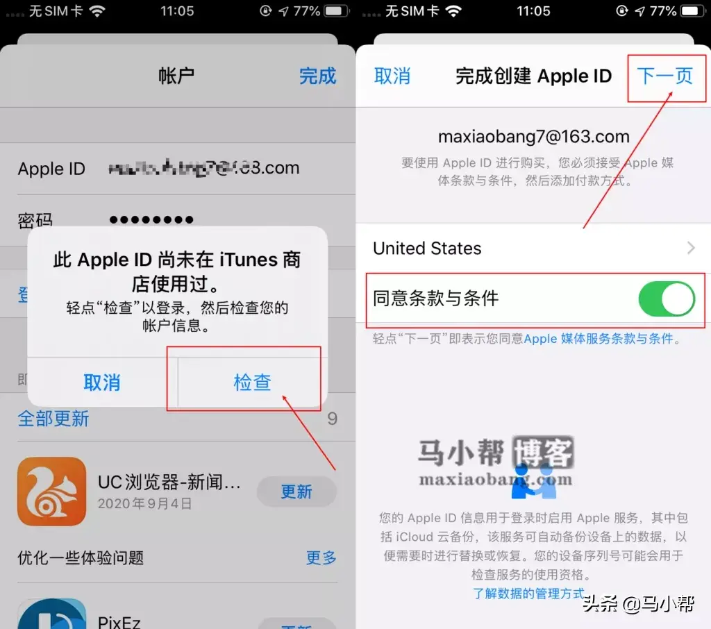 弹出此Apple ID尚未在iTunes商店使用过窗口,点击检查,然后选择同一条款与条件,下一页!