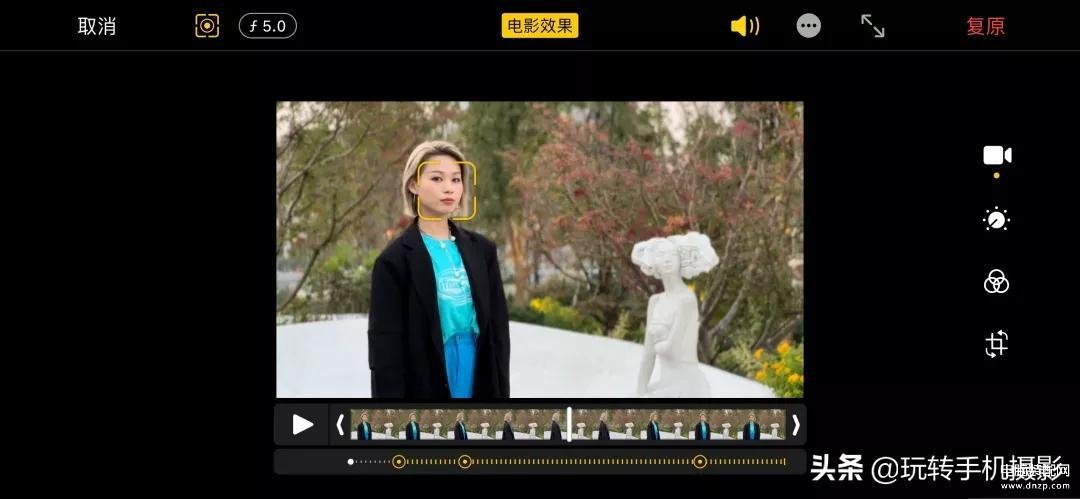 通过A15仿生芯片,iPhone 13的电影效果可以模拟出来景深效果,所以后期也可以二次对焦点以及调整背景的虚化程度。