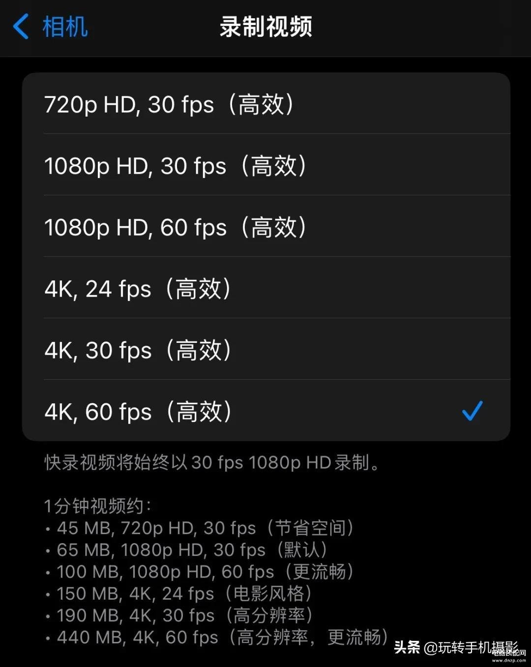 除了在相机设置当中选择视频规格,在录制视频界面轻点右上角可以在高清或 4K 录制与 24、30 或 60 fps 之间切换。关注玩转手机摄影,后续会结合一些实际案例教大家一些短视频的拍摄手法。