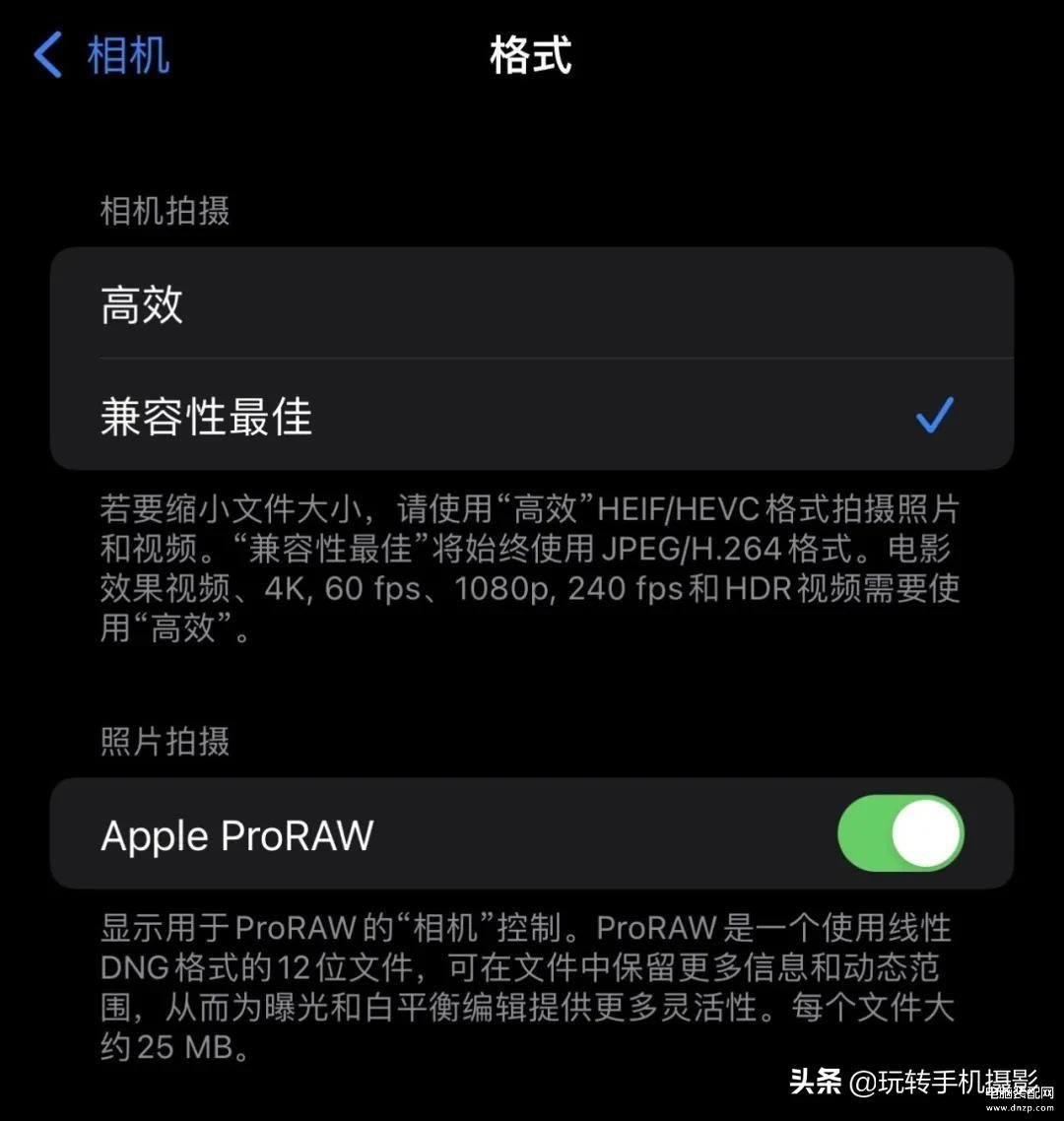 iPhone提供两种媒体存储格式,iPhone 12/13 Pro系列则多了一个Apple ProRAW。