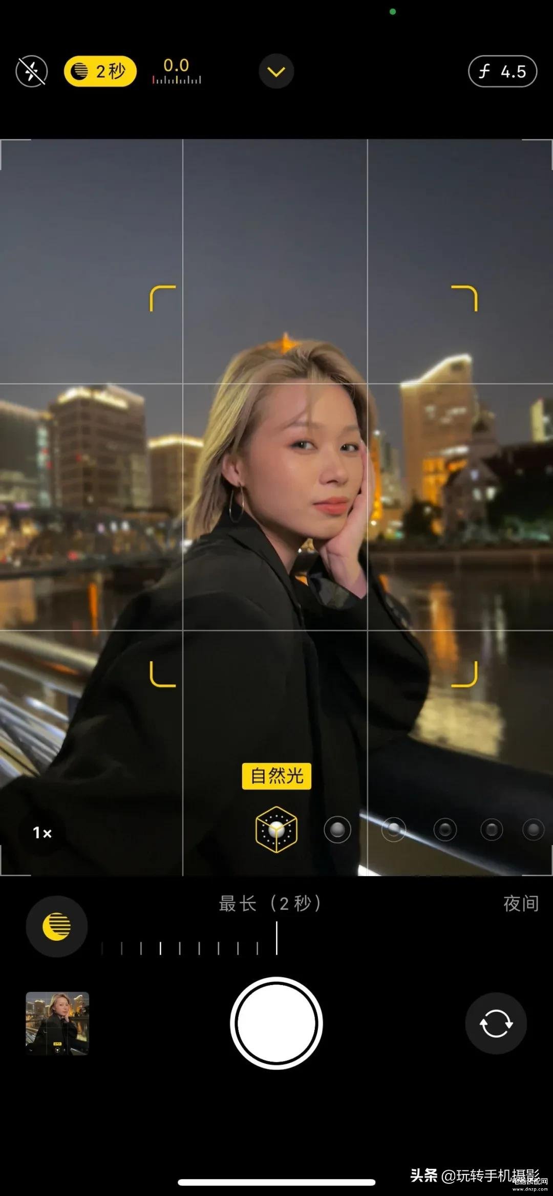 iPhone「夜间模式」会识别手机的稳定情况,所以如果你想获得更长的爆光时间,建议将手机固定在三脚架上面,这样能获得最高30s的爆光时间。