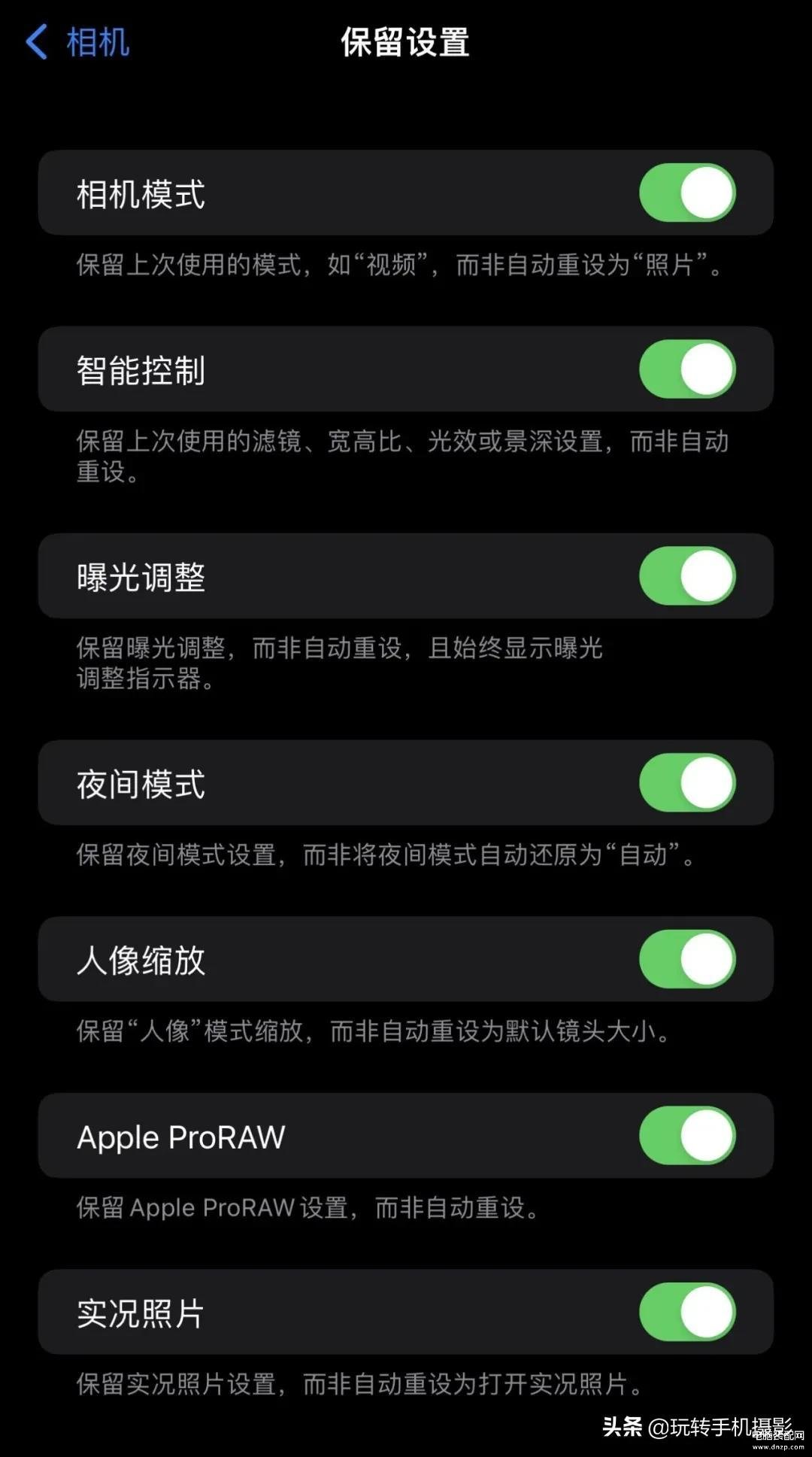 「保留设置」实际上就是保留摄影师的使用习惯,跟前面提到的摄影风格逻辑是一样的。开启这个功能之后,相机会保留你上一次使用的相机模式、滤镜、光效、景深和实况照片等等。