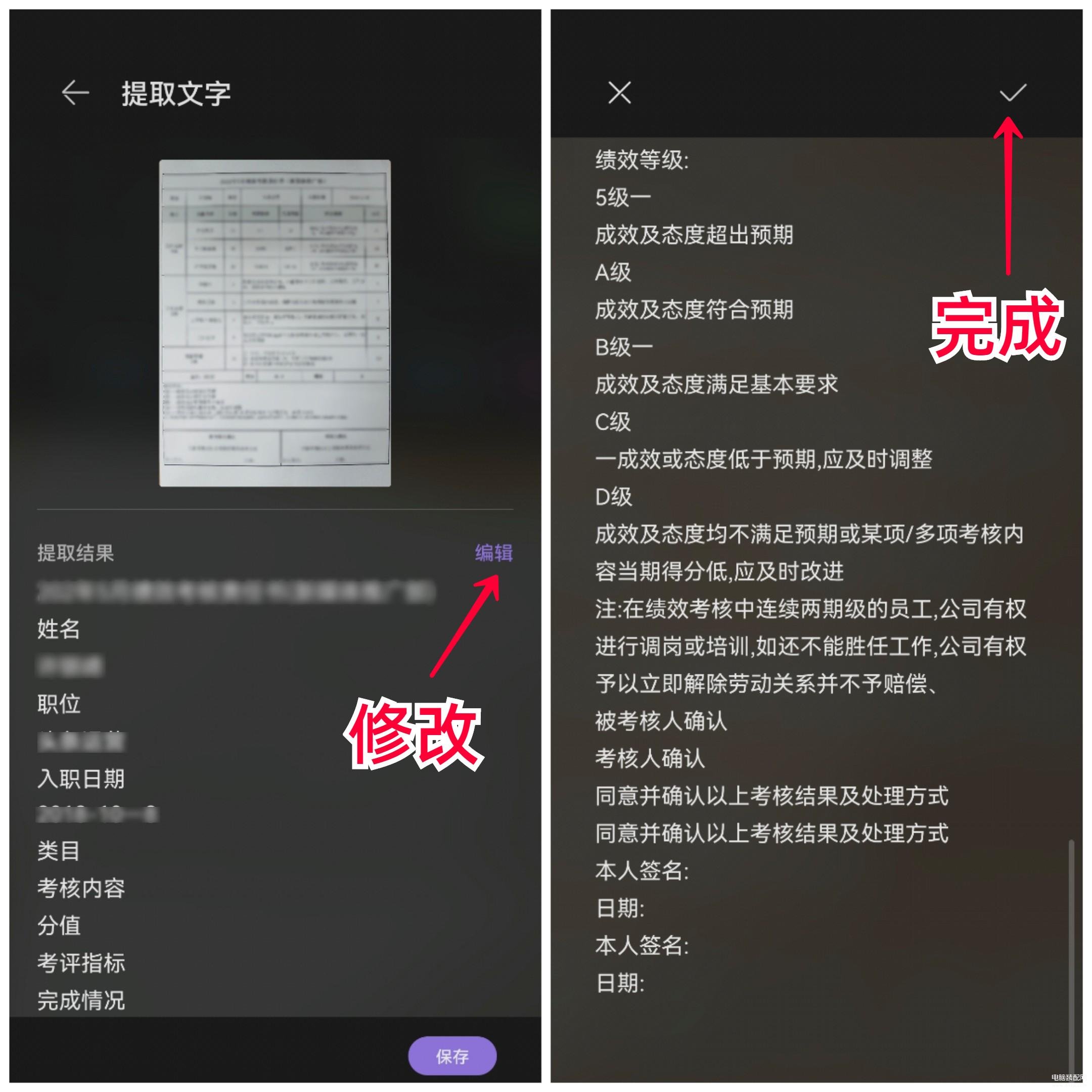 如果你想提取文档内容,那么在扫描完成后,点击左下角的「提取文字」,就能立刻将纸上文字提取出来,支持编辑修改文本。