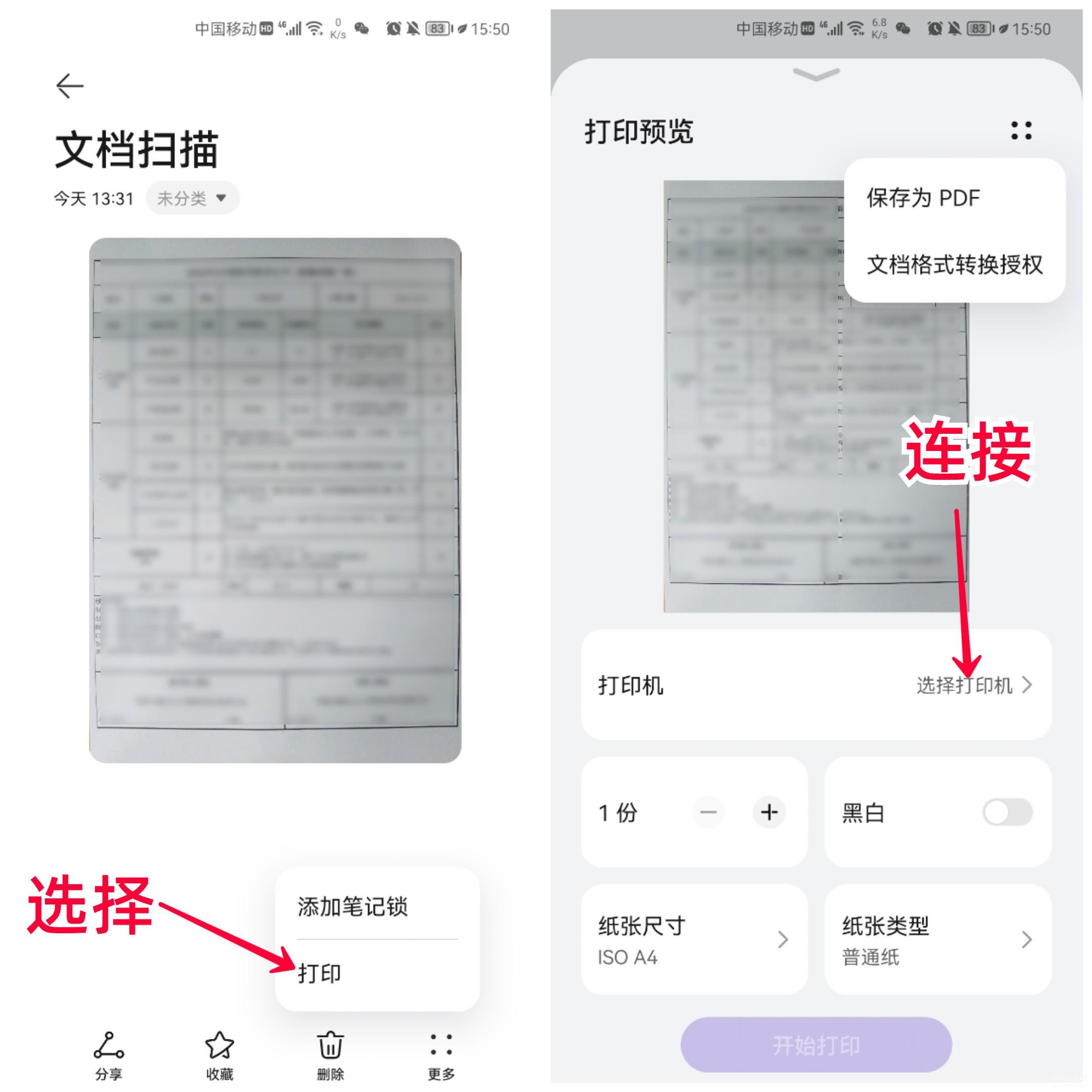 最后我们保存电子档到备忘录笔记,点击右下角的「更多」,就能选择「打印」文档了,手机连接打印机,直接打印到A4纸上。
