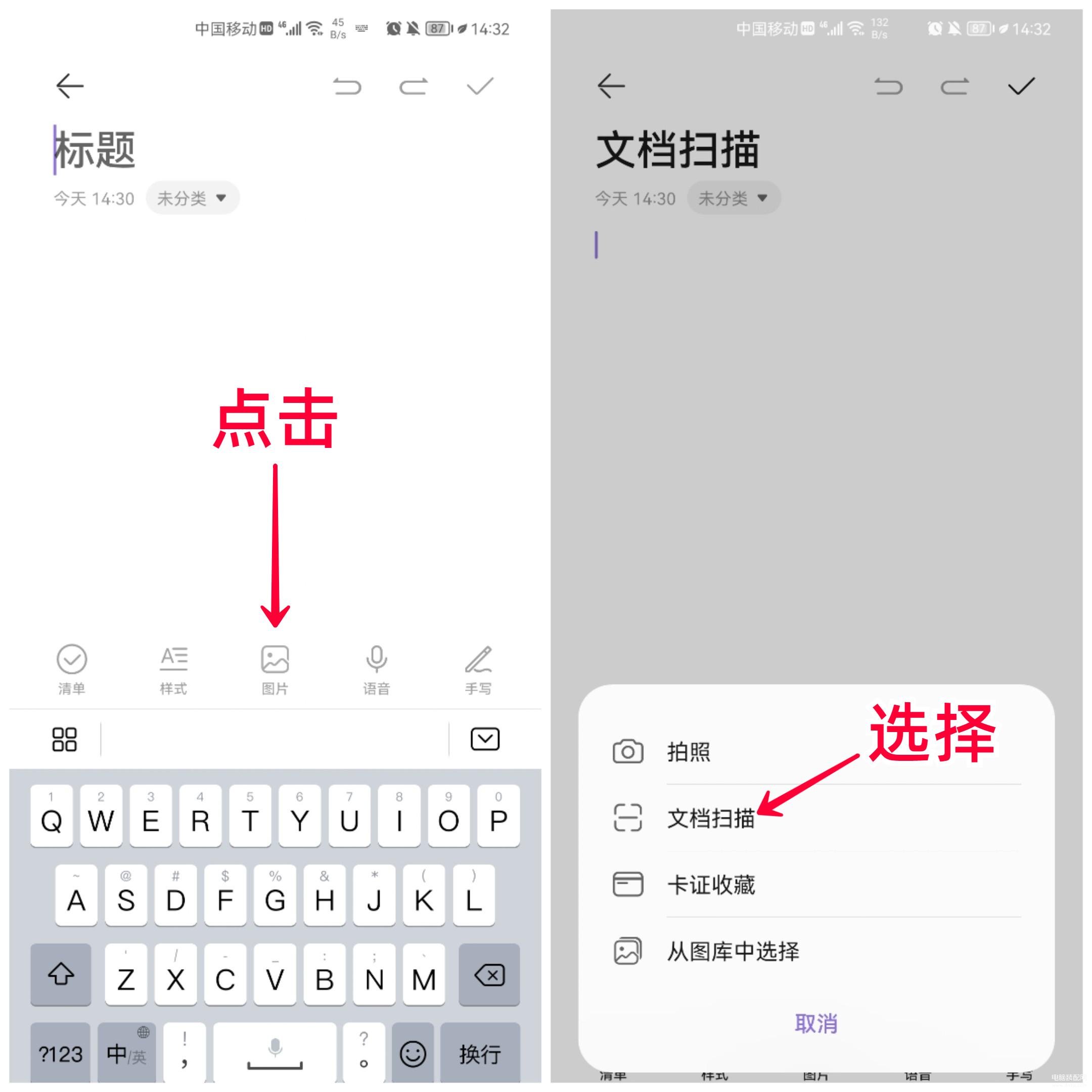在新的笔记界面,先输入标题,再进行「换行」,然后点击键盘上方的「图片」,底部会弹出4个功能,我们选择「文档扫描」。