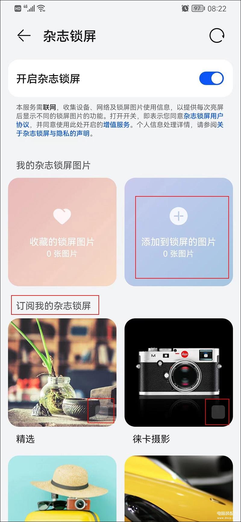 此时我们会看到有一个【订阅我的杂志锁屏】选项,因为我们想让手机锁屏只显示自己选定的照片,所以得把该选项底下的所有相册的勾选全部去掉。然后同样是在该页面,点【添加到锁屏的图片】选项,通过该选项设定我们想设置的照片。