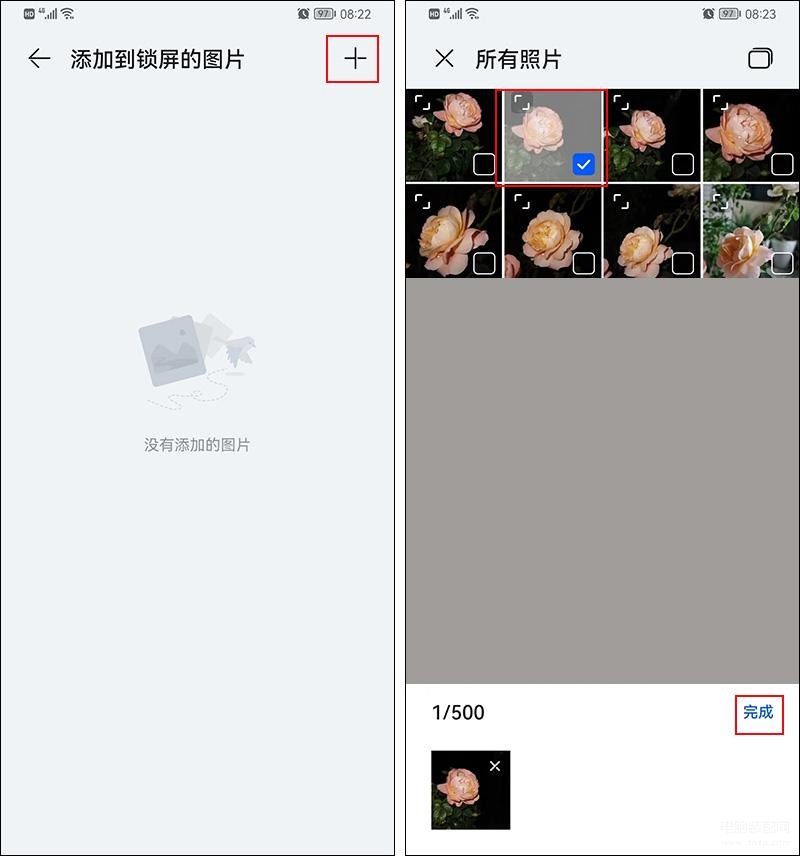 在【添加到锁屏的图片】中,选择右上角的【+】就会进入到我们的手机相册,想将哪张照片设为杂志锁屏,就勾选哪张,然后点击底部的【完成】。