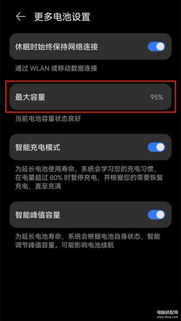 2、点击【更多电池设置】即可在最大电池容量里查看电池健康度。