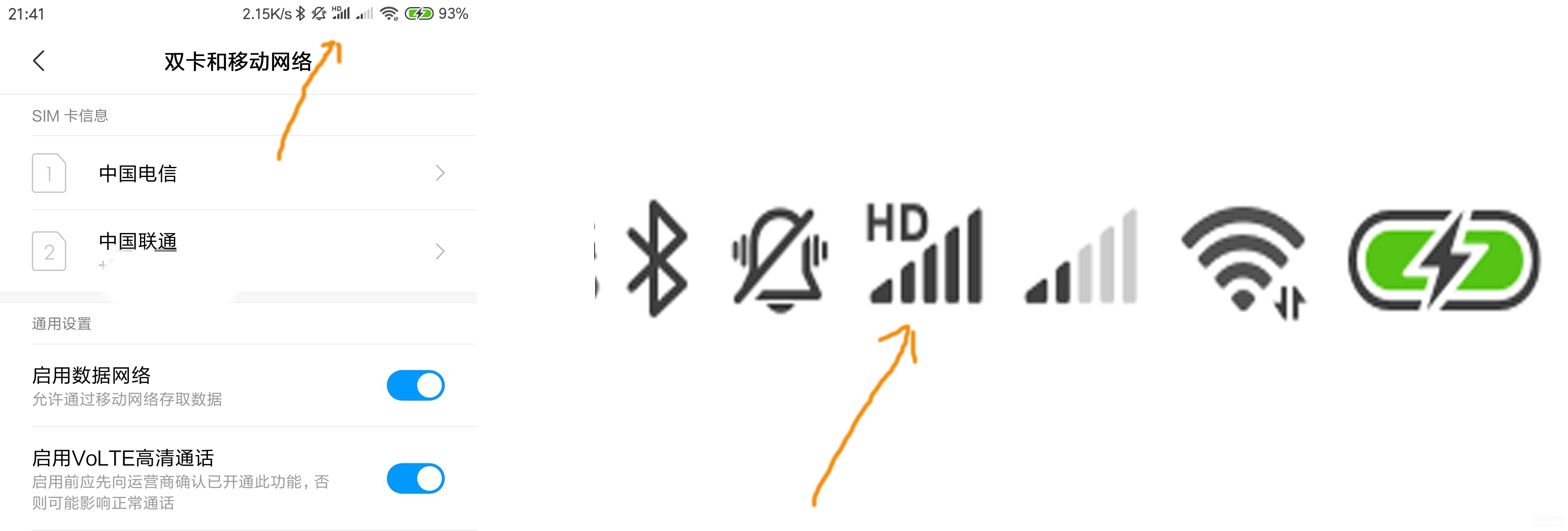 在你电信网络信号上显示英文字母”HD“标志,恭喜你,你可以享受VoLTE高清通话服务了。有的手机显示的是”VoLTE“。