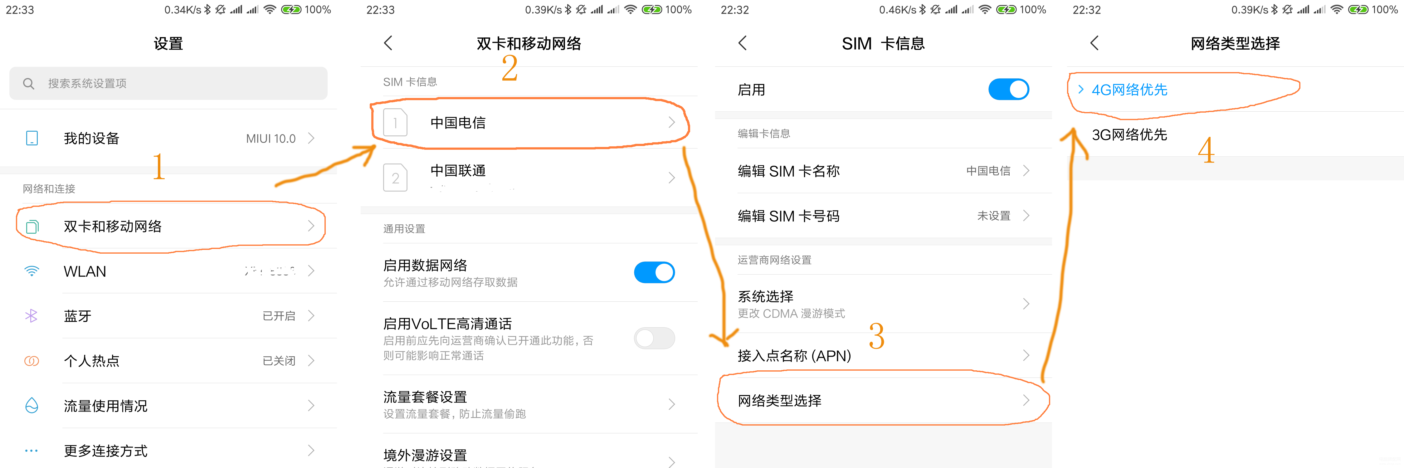 按步骤打开:手机”设置“—>”双卡和移动网络“—>”中国电信“—>”网络类型选择“—>”4G网络优先“。