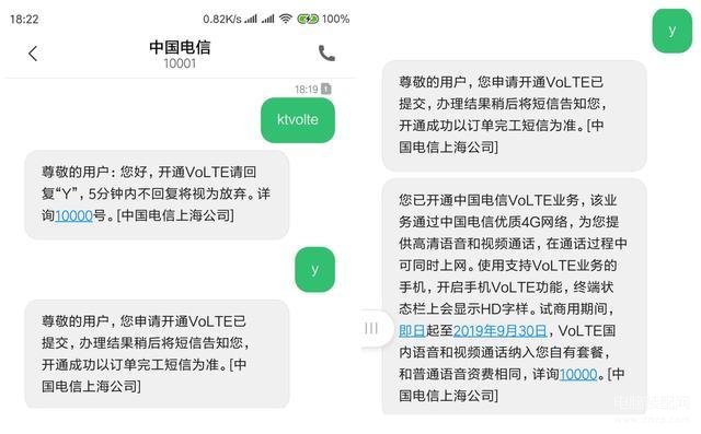 用短信发送”KTVOLTE“到10001,根据提示回复”Y“确认申请,电信10001马上告诉你申请已经受理提交,剩下的就是等待,如果电信回复你一条短信,已经 开通电信VoLTE业务,第一步就算完成。如果申请开通不成功,基本上是你当地还没有开展VoLTE业务。