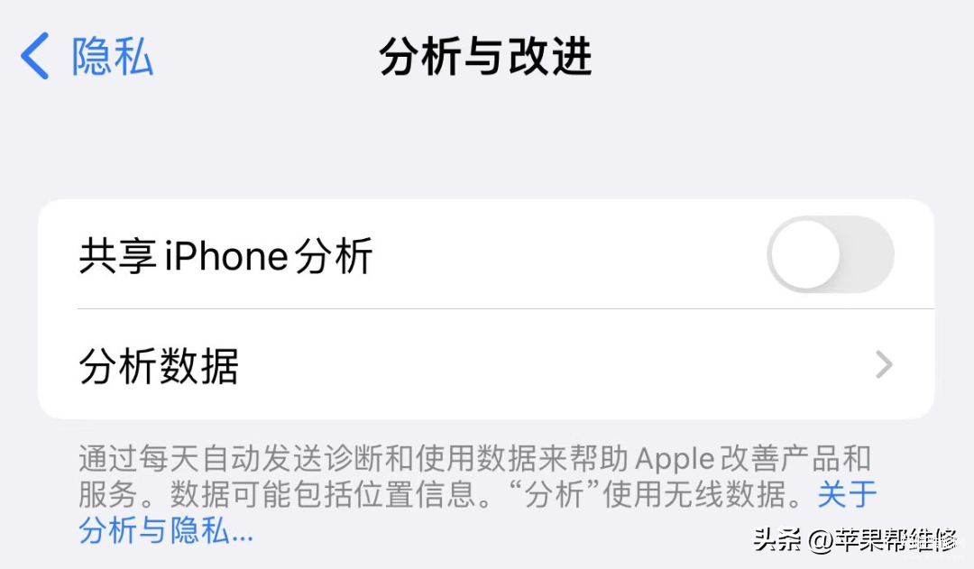 打开手机「设置」-「隐私」-「分析与改进」,关闭「共享iPhone分析」开关。此功能每日都会发送诊断和使用数据,主要是帮助 Apple 改善产品和服务。但是对个体用户来说,感觉并没有太大的作用,只是带来了额外的功耗。