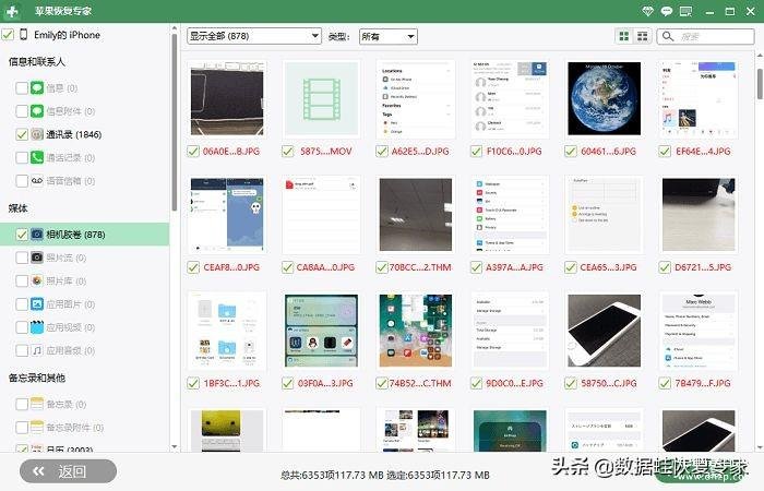 第三步:扫描成功后,我们就可以查看iPhone手机里的所有照片了,就连iCloud没有备份到的照片也能一一呈现在我们眼前,除了照片外,还可以看到视频、通讯录、通话记录、信息、备忘录、各种通讯工具的数据,只要在手机上使用过,这些数据就会出现,但也不必因此觉得不安全,数据只有自己能看到,断开连接之后,电脑将不再出现手机上的数据,所以放心使用吧。