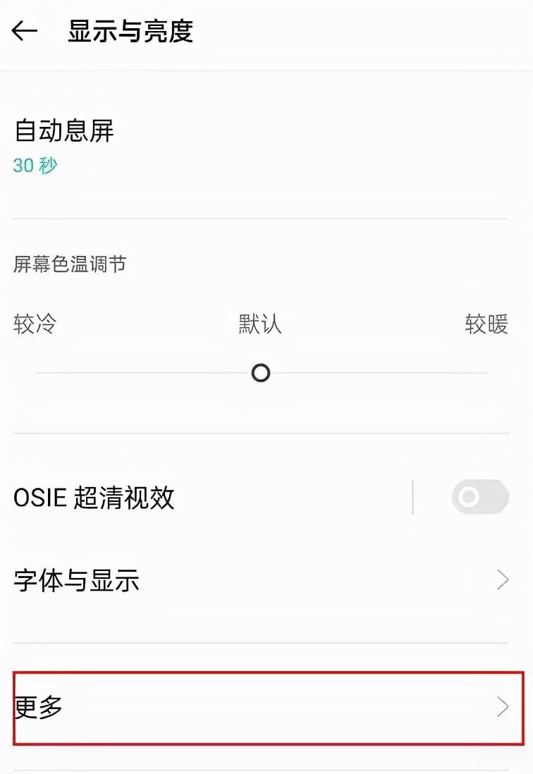 3、在OPPO手机显示与亮度界面,选择“更多”;