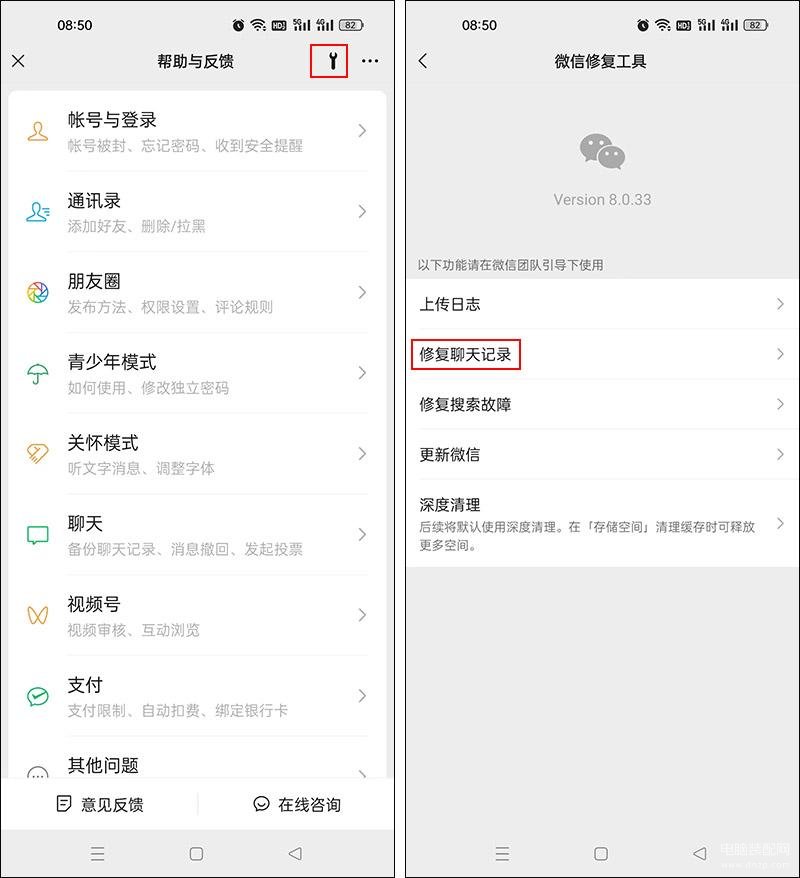 异常丢失这种情况的出现,其实是因为微信的数据是存储在手机硬件磁盘里的,要是手机内存不足等可能会导致突然故障从而使得微信数据无法读取,而反馈到我们的手机上就是微信突然闪退后,重新打开发现聊天记录没了,而微信的【修复工具】则可以通过程序找回未损坏的数据,数据找回聊天记录自然也就恢复了。