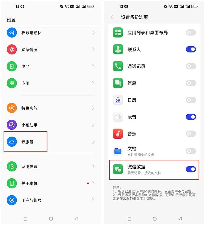 那要是从来不用电脑微信或恰好删除的聊天记录电脑上也删了怎么办?这种情况我们还可以通过手机的云服务恢复。点击手机的【设置】,下拉找到【云服务】,点击【设置备份选项】,如果看到【微信数据】项是开启的,那么就妥了。