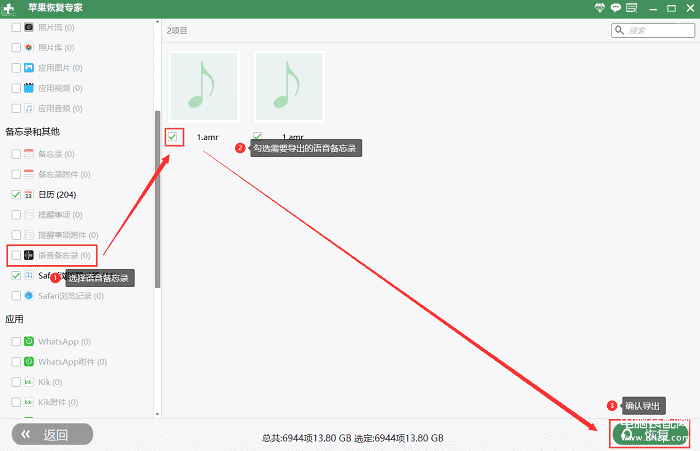 第二步:所有数据扫描完毕后,在目录栏找到语音备忘录,在挑选需要导出的部分,最后确认导出即可。