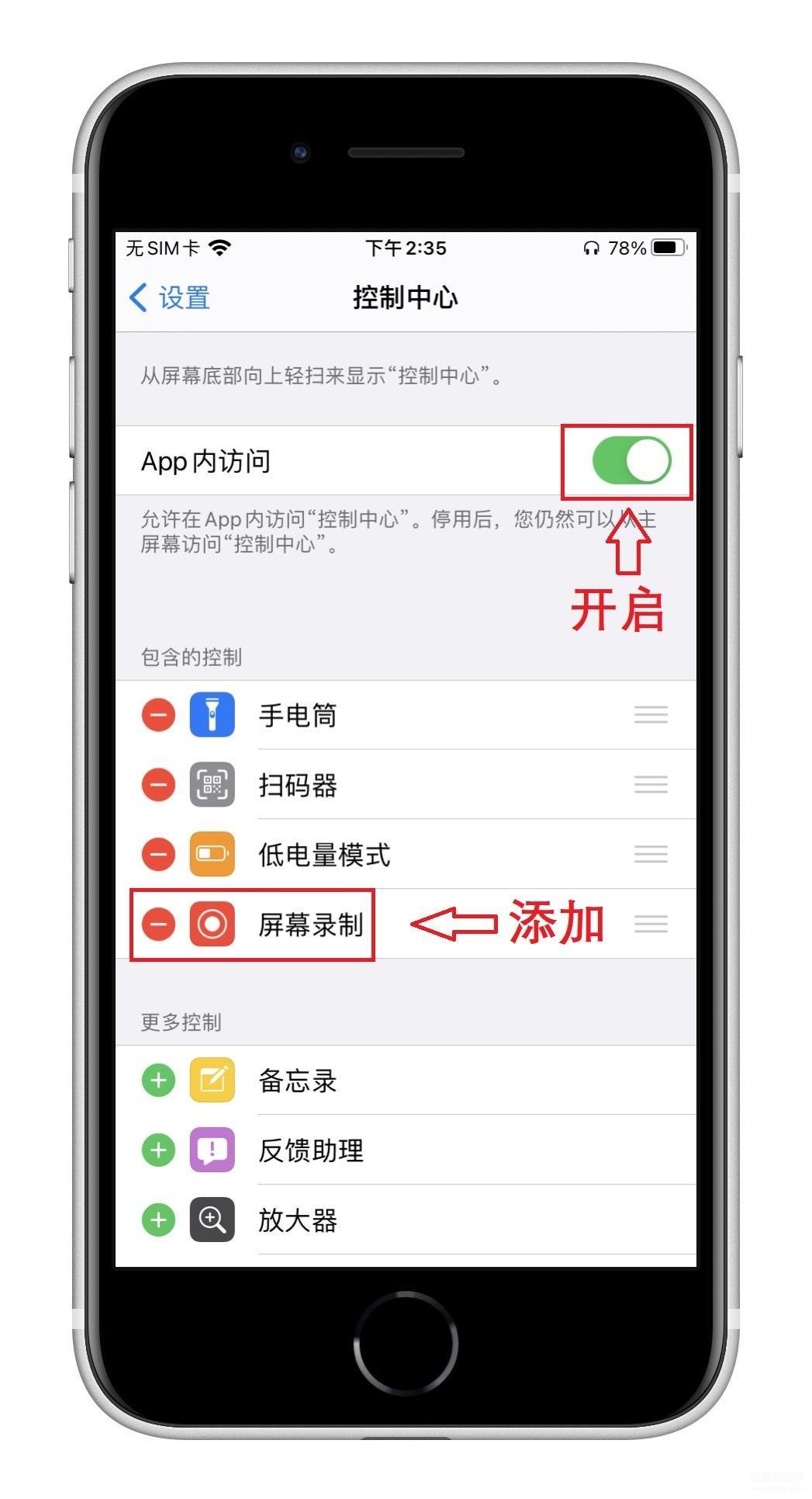 步骤五:然后从更多控制列表中,找到“录屏”功能,添加到最上面,最后开启【应用内访问】,这样就可以随时打开控制中心录屏了。