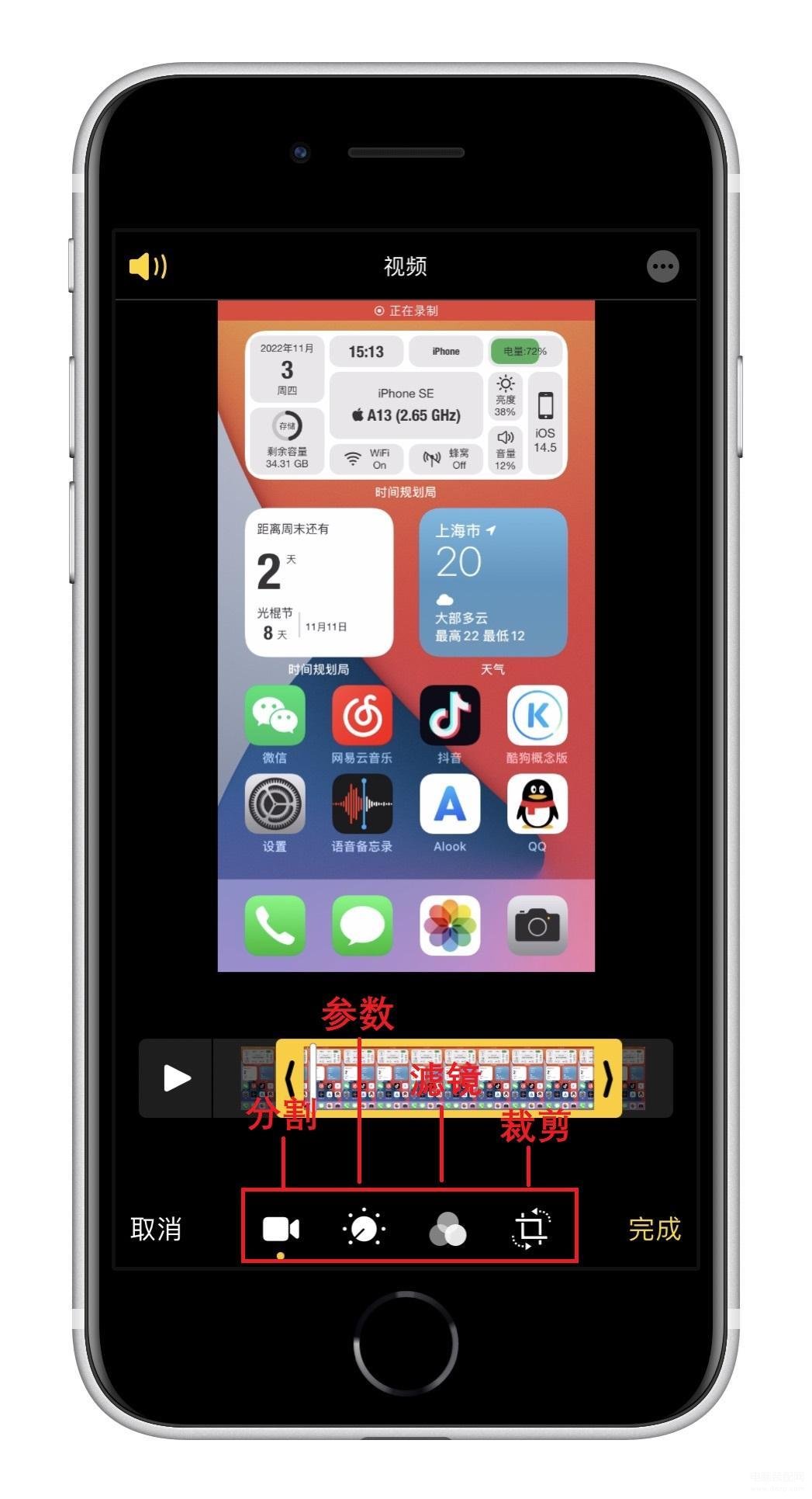 步骤六:录制的视频可以直接从相册中查看和编辑,例如:分割开头和结尾的冗余片段、裁剪视频比例、添加滤镜效果、调整视频参数等。