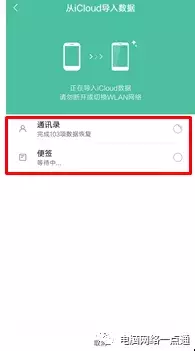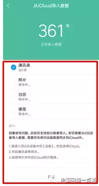 5、点击确认后,选择要导入的内容“照片、通讯录、日历、便签”,在需要的项目前打勾,然后开始导入数据。