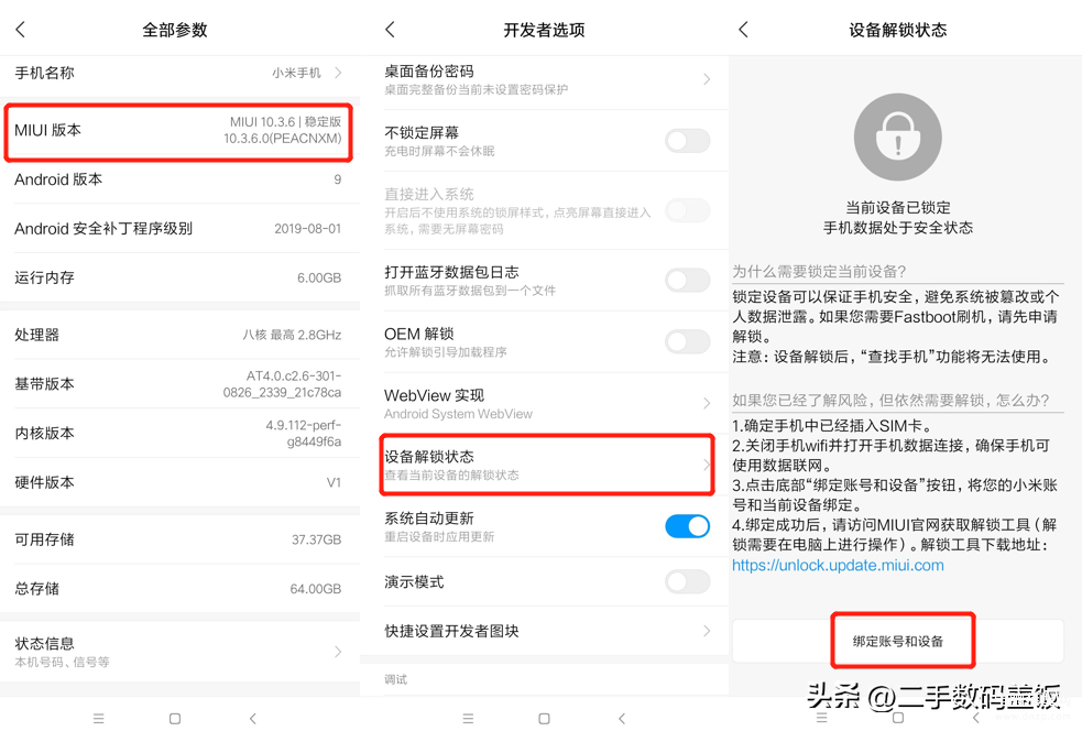 2.在设置-更多设置-开发者选项-设备解锁状态中点击“绑定账号和设备”(此操作需要关闭WiFi,使用数据流量绑定),出现“绑定成功,您的账号已与该设备绑定”即可,绑定失败建议退出小米账号再登录小米账号,小米账号绑定的手机号为该机使用手机号最佳。