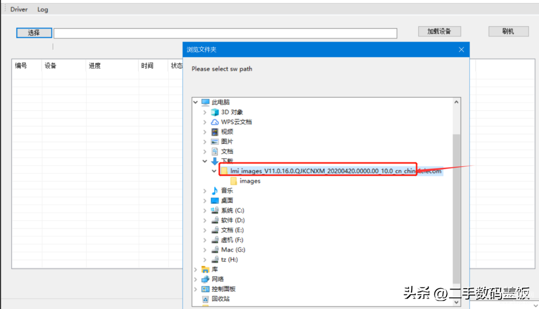 2.手机关机状态下同时按下音量减键+电源键进入fastboot模式,打开通用刷机工具,点击左上角的选择(下载完成后解压到任意位置即可,请注意路径不要包含中文,MIUI的官方可以在小米社区找到,找不到可以联系数码盖饭),选择刚刚解压的刷机包的文件夹,注意是文件夹里面的第一个文件夹,如下图,底部的按钮默认“删除全部数据并自动上锁”。