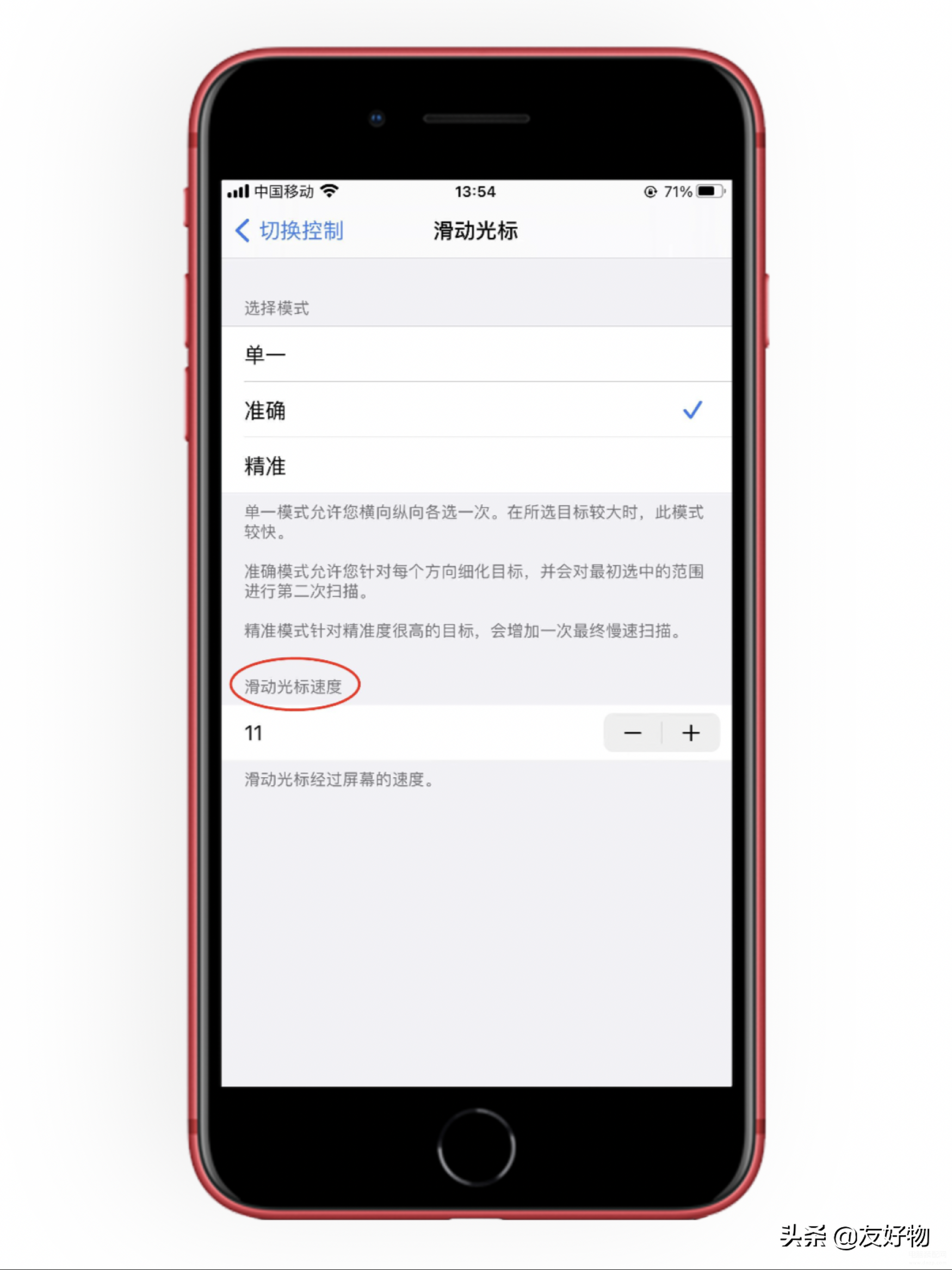 设置→辅助功能→切换控制→滑动光标→滑动光标速度(调整为11)