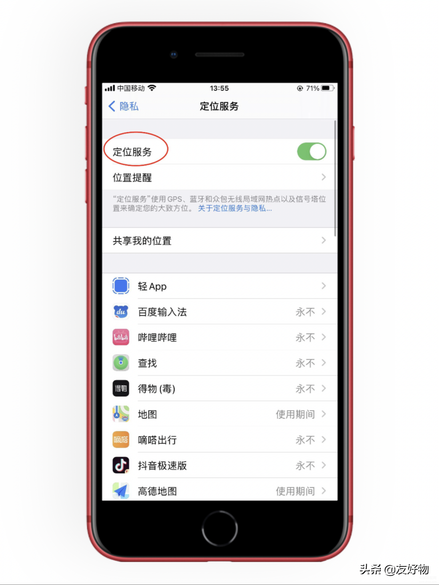 设置→隐私→定位服务→把不用的App的定位服务全部关闭,例如友友定位服务只开了微信、美团、高德地图、今日头条这4个App,其他App的定位服务全部关闭;