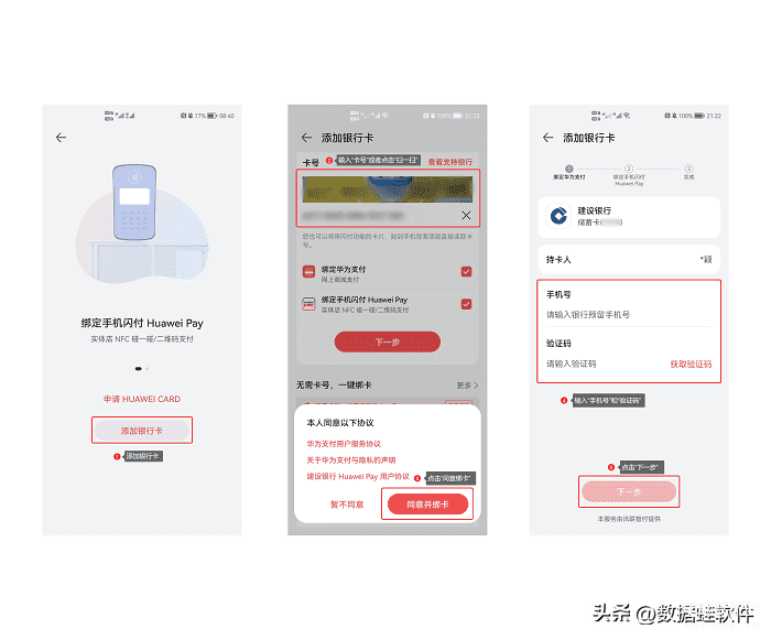 除了上述的门禁卡、交通卡,华为手机的NFC功能还能添加银行卡。很多人出门都不会带银行卡了,但是遇到大笔的消费需要用到银行卡,这时该怎么办?