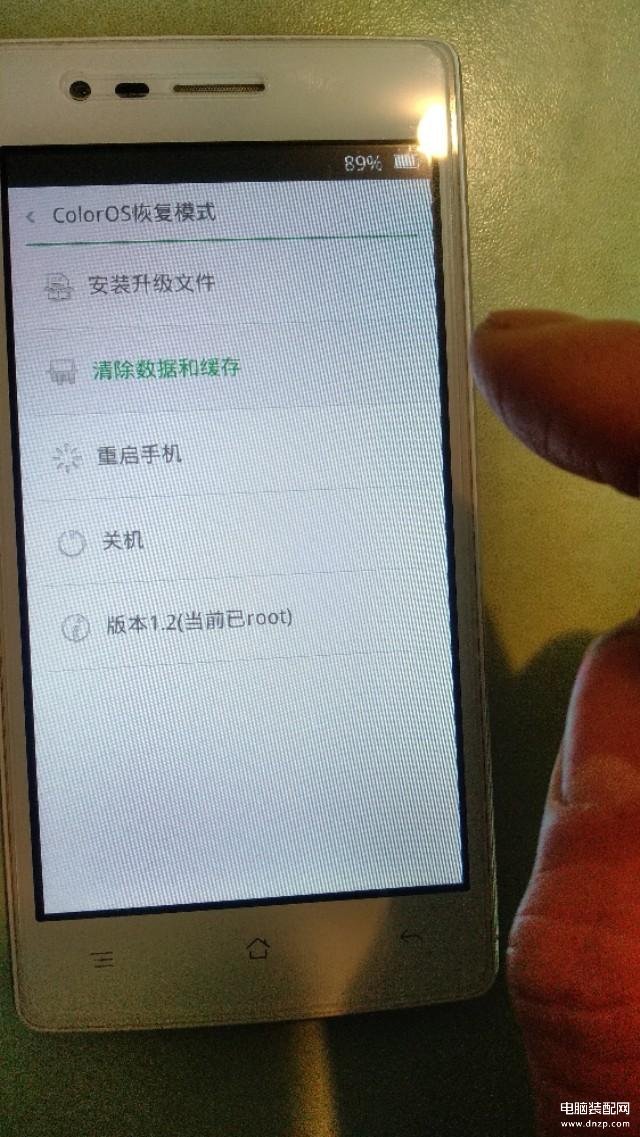 - 手机关机以后,我用一个手指按住开机键,另外一个手指同时按住调声音的下面那个键(也就是说那个减音键),按住几秒钟以后,手机开机了,看到开机界面以后,我就松开了手。