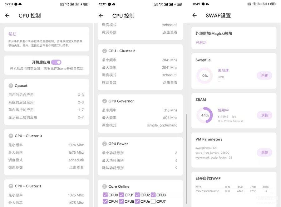 不止如此,Scene4还集成了非常多的性能管理功能,比如单独控制每个应用调度哪几个核心,设置GPU的频率范围等等。甚至可以关闭超大核心,笔者个人日常就把骁龙888的X1大核关闭了。