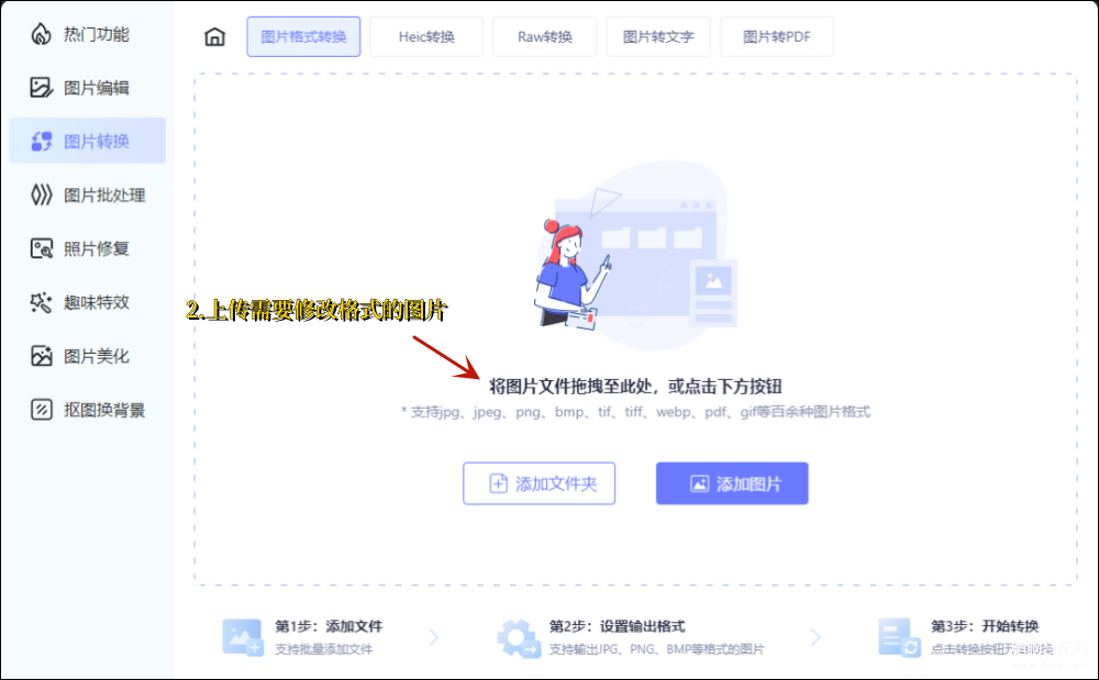 第二步:现在点击图中的【添加图片】或【添加文件夹】,将需要修改格式的图片导入到页面中来。