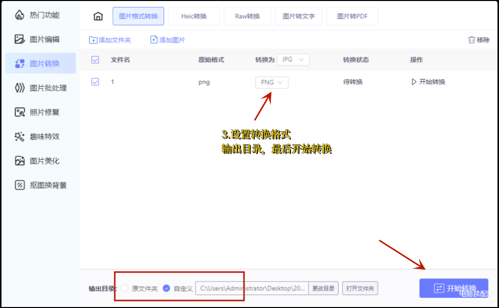第三步:我们这里上传了一张png格式的图片,上传完成后,设置转换为图片的格式,在出来的格式选择框中选择jpg即可,然后在页面的底部,设置图片输出的目录,最后选择【开始转换】即可。这样一张图片的格式转换就完成了。