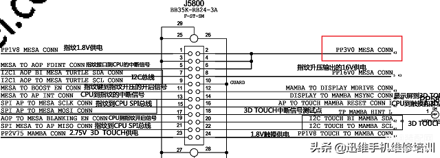 直接更换一个屏幕总成,排除指纹排线或者指纹本身问题,换了故障还是一样。测量指纹座子J5800对地阻值,发现第2脚PP3V0_MESA_CONN对地短路。