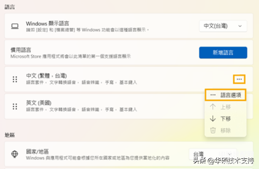 2, 在惯用语言中,选取您想要新增键盘之语言旁的[更多]图标③,然后点选[语言选项](以繁体中文为例)。